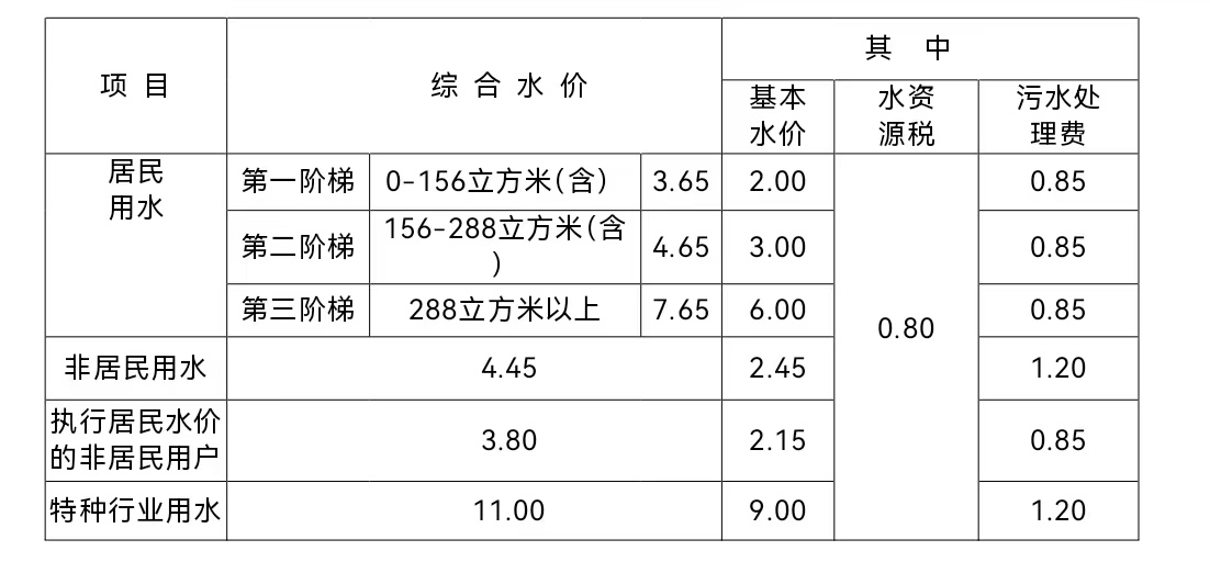 根據(jù)《關(guān)于印發(fā)城市居民生活用水價(jià)格及階梯方案的通知》(章價(jià)發(fā)【2017】27號(hào))及《關(guān)于調(diào)整城市公共供水基本水價(jià)的通知》(章價(jià)發(fā)【2019】1號(hào))文件規(guī)定,對(duì)于本行政區(qū)域內(nèi)城市管網(wǎng)公共供水、且由專業(yè)供水企業(yè)抄表收費(fèi)到戶的“一戶一表”的居民用戶生活用水實(shí)施用水階梯價(jià)格機(jī)制,按年度用水量計(jì)算,將居民家庭全年用水量劃分為三檔,水價(jià)逐檔遞增,按檔計(jì)收。目前我區(qū)城市公共供水范圍內(nèi)居民生活用水收費(fèi)標(biāo)準(zhǔn)見(jiàn)下表:
